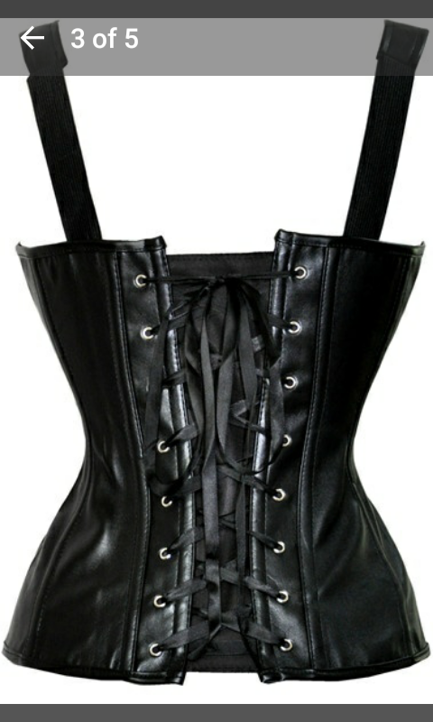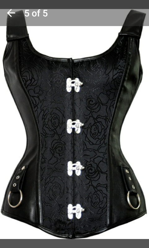 On September 10, 2016, I purchased this black faux leather and Steampunk-inspired brocade corset from the store Jenny Howard on the http://www.wish.com app. These five screenshots are from the Wish app.